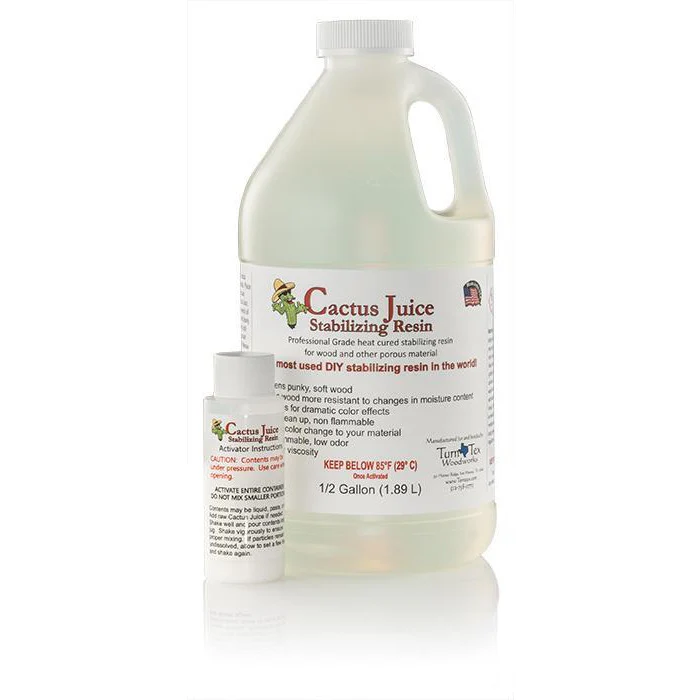 Cactus Juice Stabilizing Resin is the original premium professional grade heat cured resin for stabilizing and hardening wood and other porous material. This makes the wood harder, and much more resistant to moisture. It is especially effective on those beautiful, punky, spalted woods that are just too soft to work with! Cactus Juice is easy to use and does not significantly change the color of most woods. It is NOT solvent-based and cures 99.99% from liquid to solid by weight, far superior to typical home stabilizing solutions such as Minwax Wood Hardener or polyurethane. Stop throwing away those punky blanks and give Cactus Juice a try!